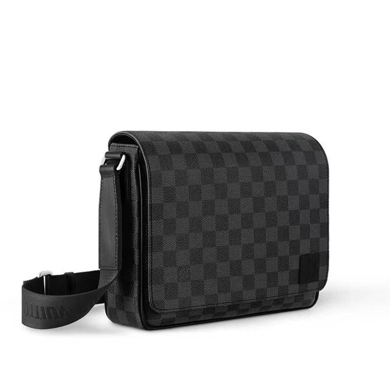 The District PM, a timeless classic, has been reimagined for this season with a smaller size and a sharper, squarer silhouette. Crafted from Damier Graphite coated canvas, the design boasts a sleek, minimalist style that emphasizes exquisite proportions. It features an exterior zippered pocket and an interior pocket for organized storage, and an adjustable shoulder strap embellished with the Louis Vuitton logo for comfortable carrying.