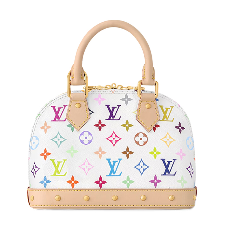 This stylish Alma BB bag, part of the playful Louis Vuitton x Murakami collection, features a silhouette inspired by Art Deco, crafted from the House's iconic Monogram coated canvas. The vibrant cherry motif by Japanese artist Takashi Murakami is embellished in vibrant hues. The bag's signature natural leather adds a touch of style to the elegant Toron top handle, base, and playful bow-shaped key holder.