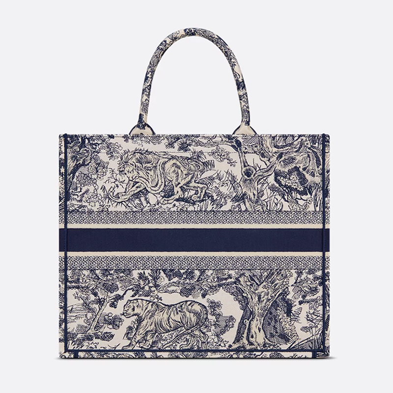 The Dior Book Tote, designed by Christian Dior Creative Director Maria Grazia Chiuri, has become a hallmark of the Dior aesthetic. This style, capable of holding all your daily essentials, Its blue and off-white Jouy print is a variation of the brand's signature pattern. Emblazoned with the Christian Dior Paris signature on the front, this medium tote bag showcases the House's signature craftsmanship and can be carried by hand or on the shoulder.