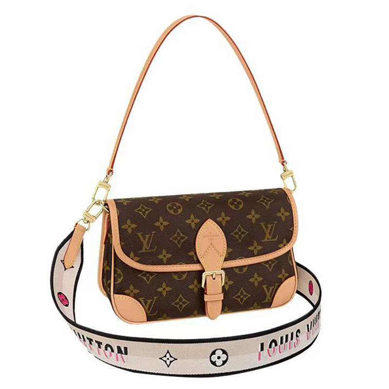 Crafted from Monogram canvas, the Diane preppy bag reinterprets a '90s classic with vintage details like leather corners and an archival buckle, combined with modern practical features like stylish pockets and organized interior compartments. The distinctive wide jacquard shoulder strap features the unmistakable Louis Vuitton signature on one side and a subtle Monogram floral motif on the other.