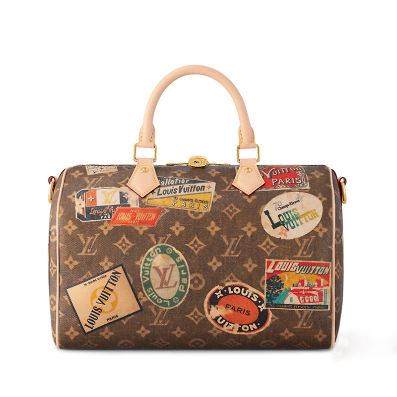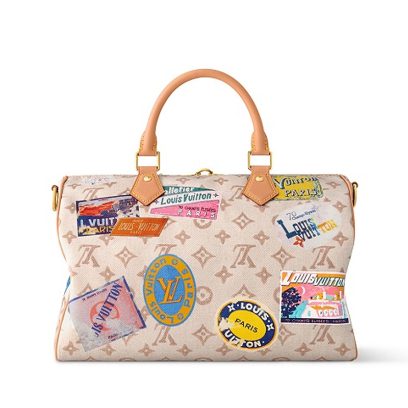 Embellished with the brand's newly redesigned Monogram Dune motif and featuring a vintage-inspired finish, the Speedy Soft 30 is the perfect travel bag. It features an airplane charm and a patchwork effect of playful stylistic labels inspired by Gaston Louis Vuitton's original collections. The long handle allows for shoulder carry.